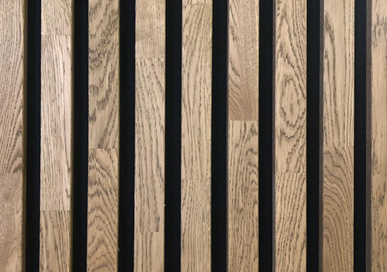 Os painéis acústicos Green Forest, são compostos por uma base em Feltro preto de alta qualidade, e por ripas de carvalho/nogueira maciças, unidas longitudinalmente com a tecnologia micro-junta.