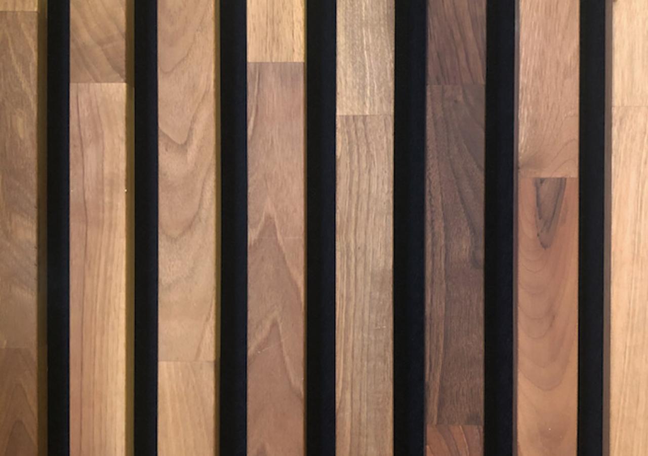 Os painéis acústicos Green Forest, são compostos por uma base em Feltro preto de alta qualidade, e por ripas de carvalho/nogueira maciças, unidas longitudinalmente com a tecnologia micro-junta.